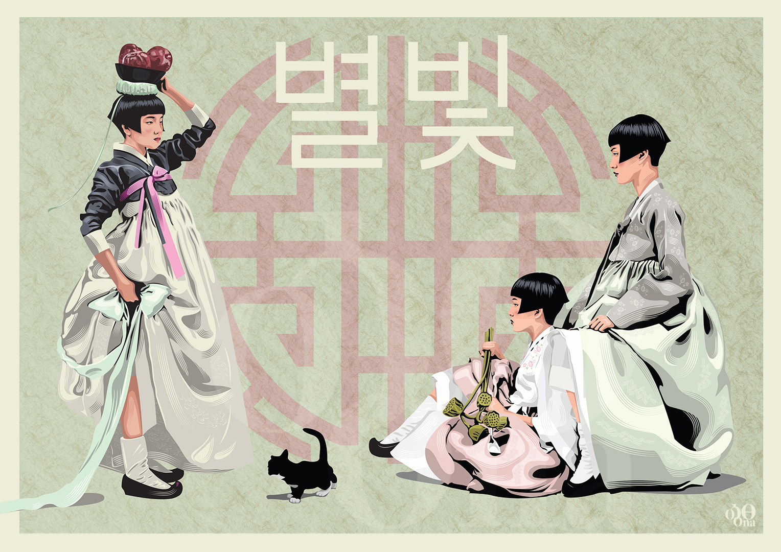 Fashion Illustration referencing Vogue Korea's 2008 series 'Full Moon Story' by renowned fashion photographer, Kim Kyung Soo featuring the traditional Korean costume (Hanbok)