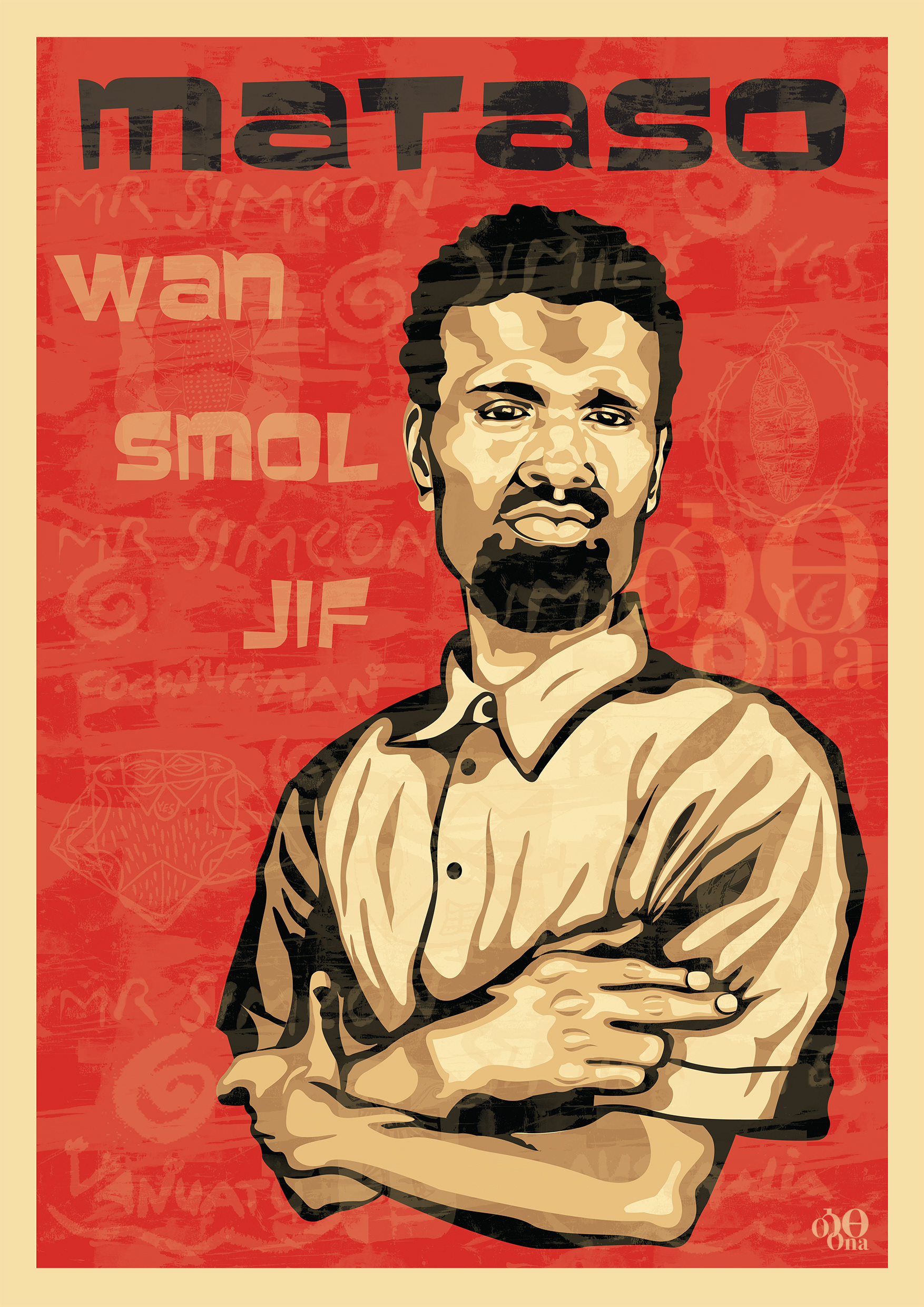 A portrait of Simix Simeon, leader of the Vanuatu art collective Awis Artis Blong Vanuatu from Mataso Island. Wan Smol Jif means Small Chief in Bislama, the national language of Vanuatu.