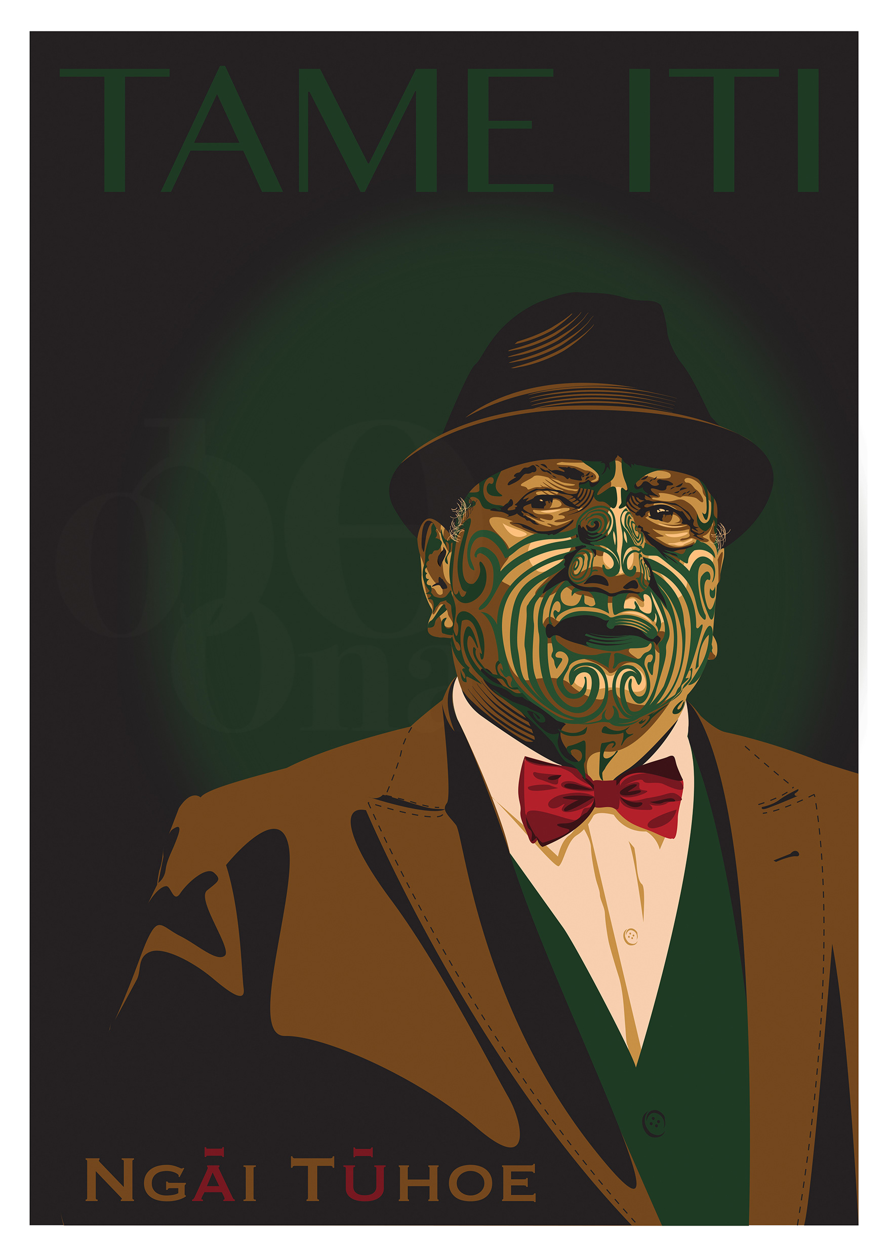 A portrait of New Zealand Maori activist, Tame Iti of the Ngāi Tūhoe tribe wearing a full Ta Moko (face tattoo).