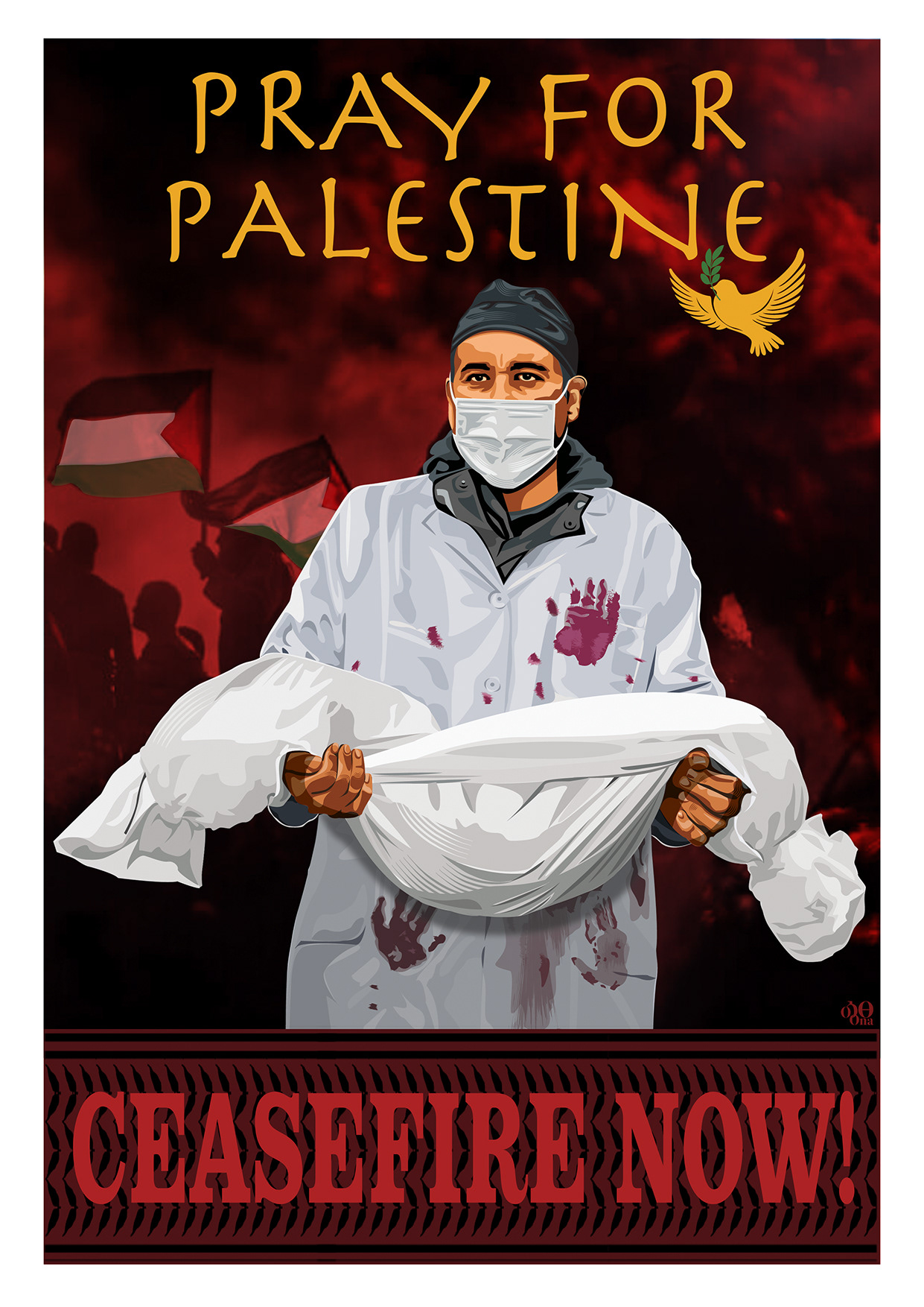 A poster depicting the genocide of the Palestinian peoples of Gaza by Israel.