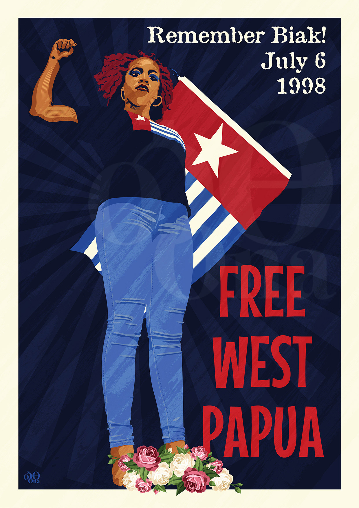 This poster design commemorates the date of the Biak Massacre on the island of Biak, West Papua by the Indonesian Government on July 6th, 1998.